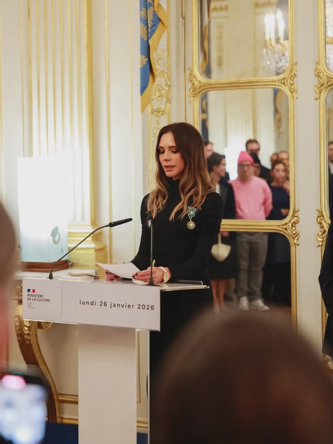 1月26日星期一,在巴黎时装周期间,这位51岁的时装设计师被法国文化部授予艺术与文学骑士勋章。维多利亚与丈夫大卫·贝克汉姆、14岁的女儿哈珀以及20岁的儿子克鲁兹和23岁的儿子罗密欧一同出席了授勋仪式。