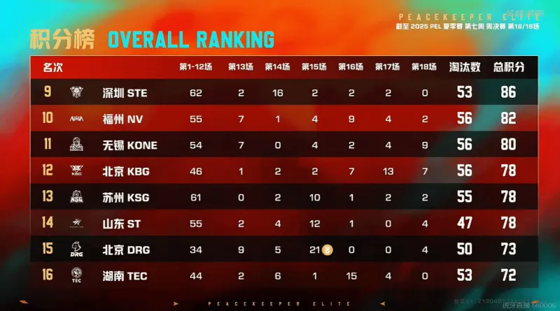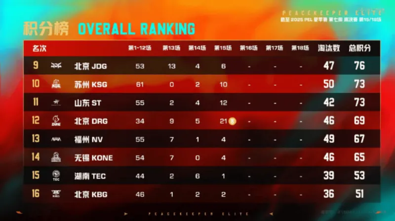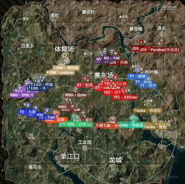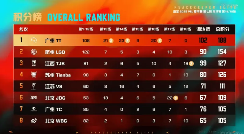 7分钟KSG高打低优势淘汰STE一人后,直接快速跑路,不做逗留。9分钟,TT被DRG先收走三人,随后最后一人被Tianba带走。15分钟,TC先击倒KBG两人后,随后走位不慎被KBG反击倒三人,最后TC死亡三人,KBG无伤亡。18分钟,STE被NV在野外淘汰。23分钟WBG淘汰KBG,Tianba被JDG-Paraboy淘汰二人后,最后一人被VS淘汰。决赛圈,TJB先淘汰VS,在淘汰KONE吃鸡。