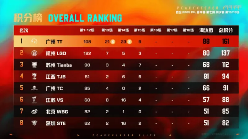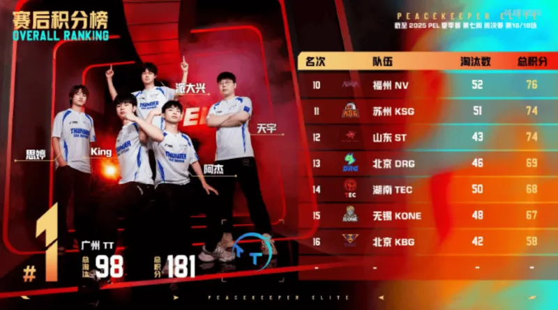 11分钟,VS守株待兔等到了TC挨个出击的机会,最终TC被TJB和VS联合淘汰,并且VS无伤亡。决胜时刻,信号圈缩在靶场附近,圈内剩余广州TT战队、江苏VS战队和深圳STE战队,此时场上3v2v2。VS战队先被淘汰出局,随后剩余两队展开对战,STE战队出枪破点,TT战队先倒两人,最终派大兴独狼作战精准出枪将STE战队逐个击破拿下比赛,TT获得本场比赛胜利。