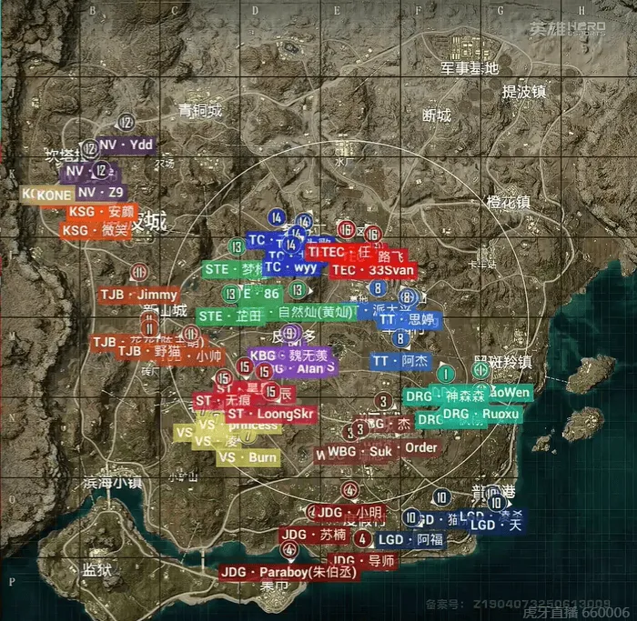 开局,TJB与VS共同roll点,TJB-花花率先击杀一个后,双方展开了8分钟的拉扯战,无事发生,同时TT两人被守卫击倒,但队友支援及时,也无伤亡。决胜时刻,信号圈缩在龙城附近,圈内剩余广州TT战队、江苏VS战队和北京JDG战队,此时场上4v3v1。JDG战队独狼先被VS战队淘汰出局,随后剩余两队展开对战,派大兴一雷双响帮助队伍拿下比赛,TT获得本场比赛胜利。